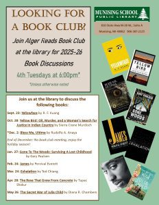 Alger Reads Book Discussion Group meets on the fourth Tuesday of the month at 6 pm.